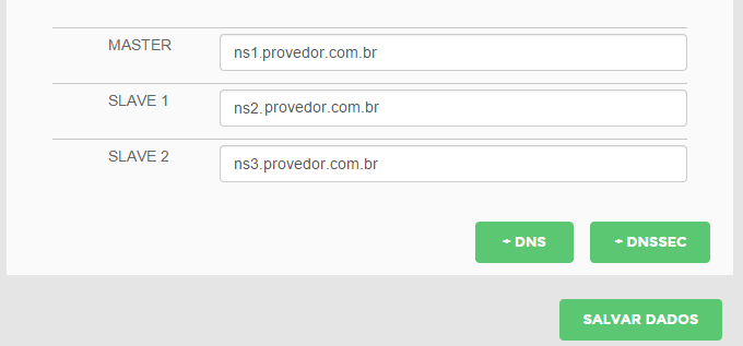 4 - Verifique os DNS (nameservers) que foram informados em seu email "Informações - Conta Configurada", agora será necessário adicionar ou alterar os nameservers MASTER, SLAVE 1 e SLAVE 2 conforme imagem abaixo:
